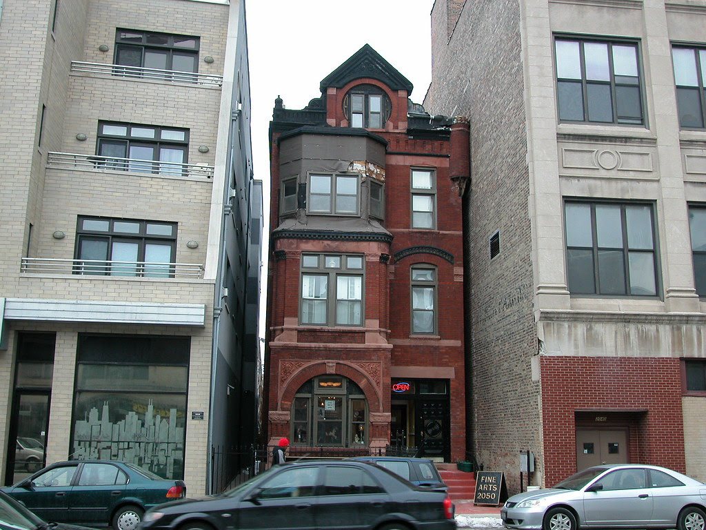 On some blocks, like the one shown above on North Avenue just west of Milwaukee in Chicago, one will find the houses that survived the development waves. Some of these houses stand alone, adjacent to parking lots. Their futures are doubtful, since they stand apart from the historic context that would make their defense likely should a developer want to take the house and the adjacent lot and build a new building. In Chicago, tear-downs like that seem to happen weekly. The new construction is often an insipid four or five story building with street level retail and condominiums above, rendered in a bland minimalist style or a gaudy postmodernist mess.